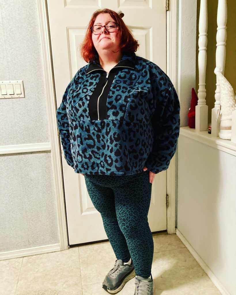 I wish I’d done a selfie of the two of us in our quarter-zip fleece tops and comfy activewear pants, all cozy and cute. I did, however, talk my mom into taking a pic of me in my “leopard finery,” to record it for posterity and share it on ye olde internet. Maybe you can see by my expression what kind of night it was and how much fun I had.