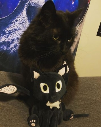 Here’s one last pic, for your enjoyment. I remembered I had said I would post my other cat. I present Happy, posing with my Displacer Beast. It looked so much like him, I had to have one. He mostly displaces cat food, however. Peace!!!