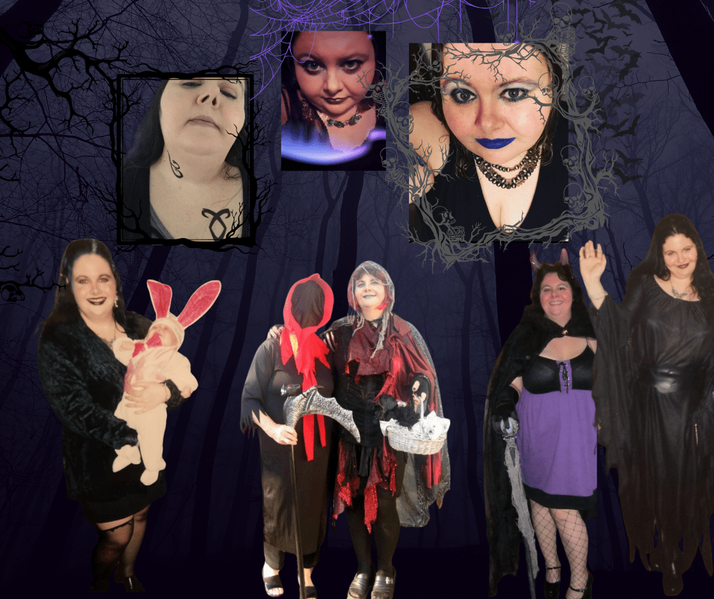 Here’s a retrospective of some of my gothier Halloween costumes, amusingly arranged in a Canva graphic, as though I’m haunting a spooky woods, and a few looks I put together just for going out (the filtered center top pic and right corner pic were just evenings out on the town). The bebe bunny on the left would be kiddo on her very first Halloween.