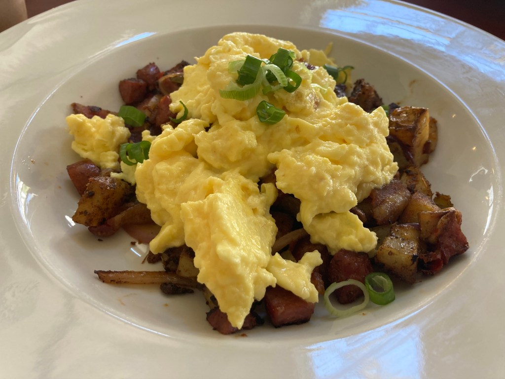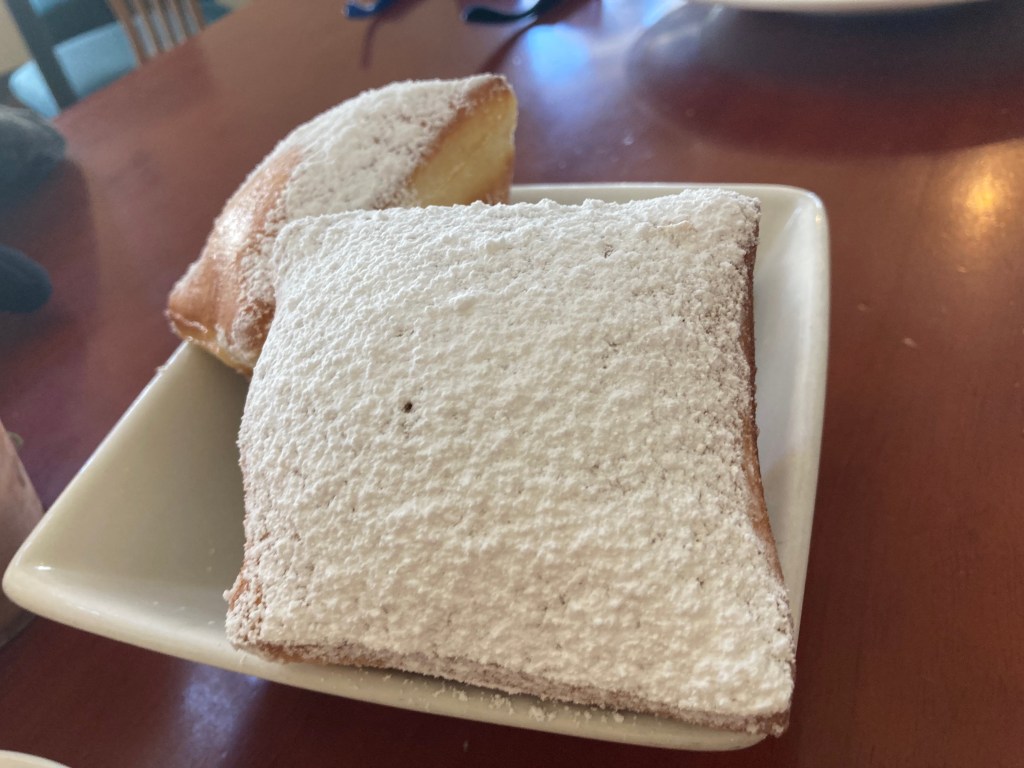 I had the Louisiana Skillet, which you see below, along with the order of beignets we split. My mom ordered a quesadilla, which turned out to be ENORMOUS. My daughter I think just had a beignet and a chai. I had a chai, as well. Mom got the quesadilla remnants boxed and wasn’t up to a beignet. I have one left yet. You get three with every order.