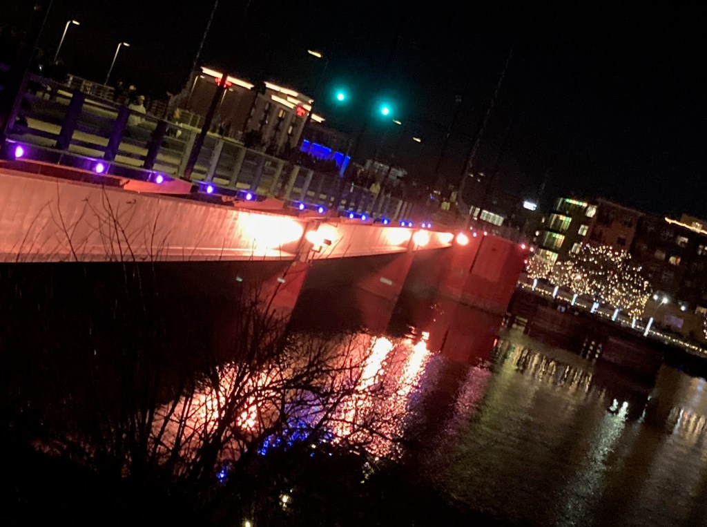 Above, is the first view of the river, and part of the bridge we crossed, and the lights along the City Walk, downtown.