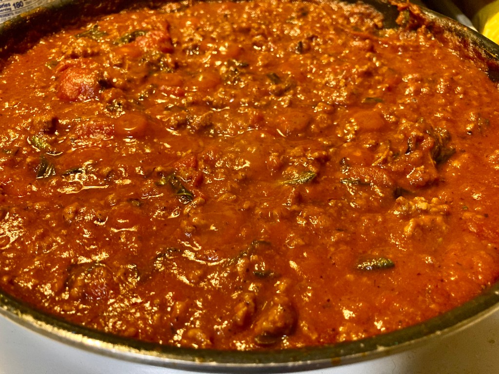 Though really, this is just the meat sauce. I’ll boil the noodles tomorrow. Good thing I got salt, to help the water boil. Could’ve used a splash of olive oil to keep the noodles from sticking. Hm. Hadn’t thought of that ’til just now. Well, I can always add butter once they’re on the plate, if needed. Again, less authentic, but workable.