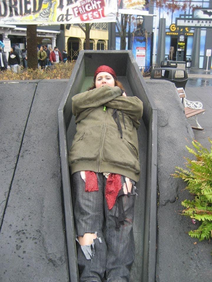 Old pic of me at Fright Fest, posing in a coffin, probably pretty exhausted, but trying to be a sport about it, cranky about wanting the photo to turn out nice LOL. I was dressed as a pirate, vaguely, which was probably more impressive under the jacket. Since it wasn’t a store-bought costume and was mostly my regular clothes adapted, they didn’t say anything. But evidently at least at that point, adults were banned from wearing costumes in the park. Maybe because they would look like employees and could thereby perpetrate bad things.