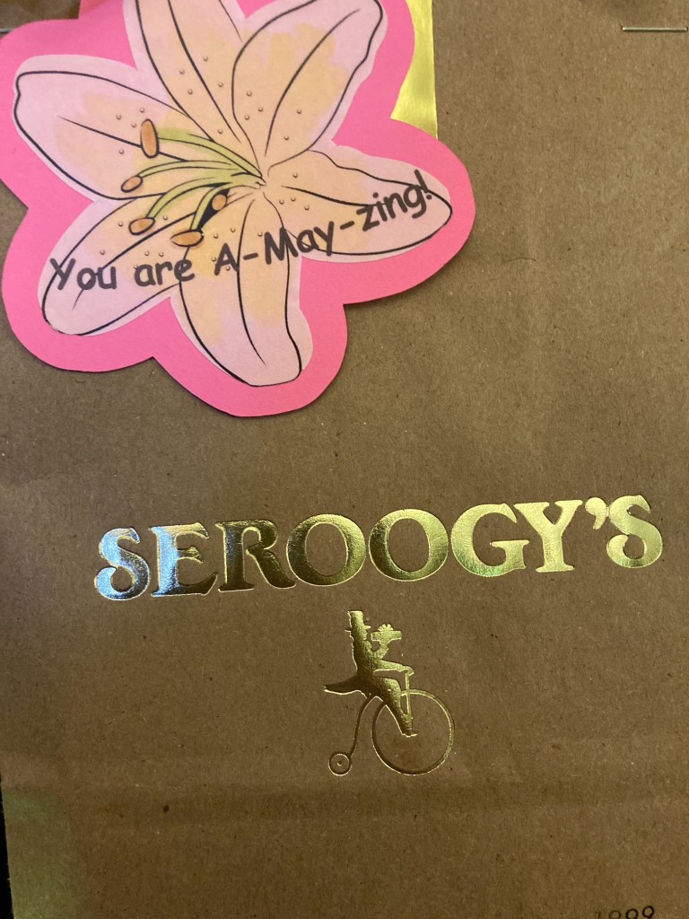 I worked the night before, and discovered a bag of Seroogy’s candy waiting for me in my locker, when I got there, and stashed my purse. It was an INTENSE shift, especially after close, and I blew through all but one stray Jelly Belly jelly bean when I got home. But that was also partly because I didn’t have much left for groceries and wasn’t up to a food run of any kind.