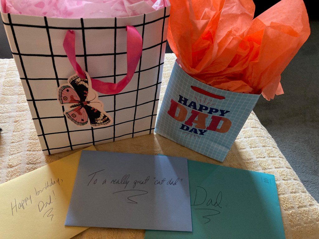 The other cards, one was a licensed Indiana Jones birthday card, and the other had one of those wearable buttons poking through the front. From the cover of the card, it LOOKED like it was saying he was a number one dad, and suggested the button was something he could wear on his special day, to let everyone know what a great job he’d done as a dad. But when you open it, and see the WHOLE button, it actually says “My Daughter is #1.” LOL. He laughed a lot at that.