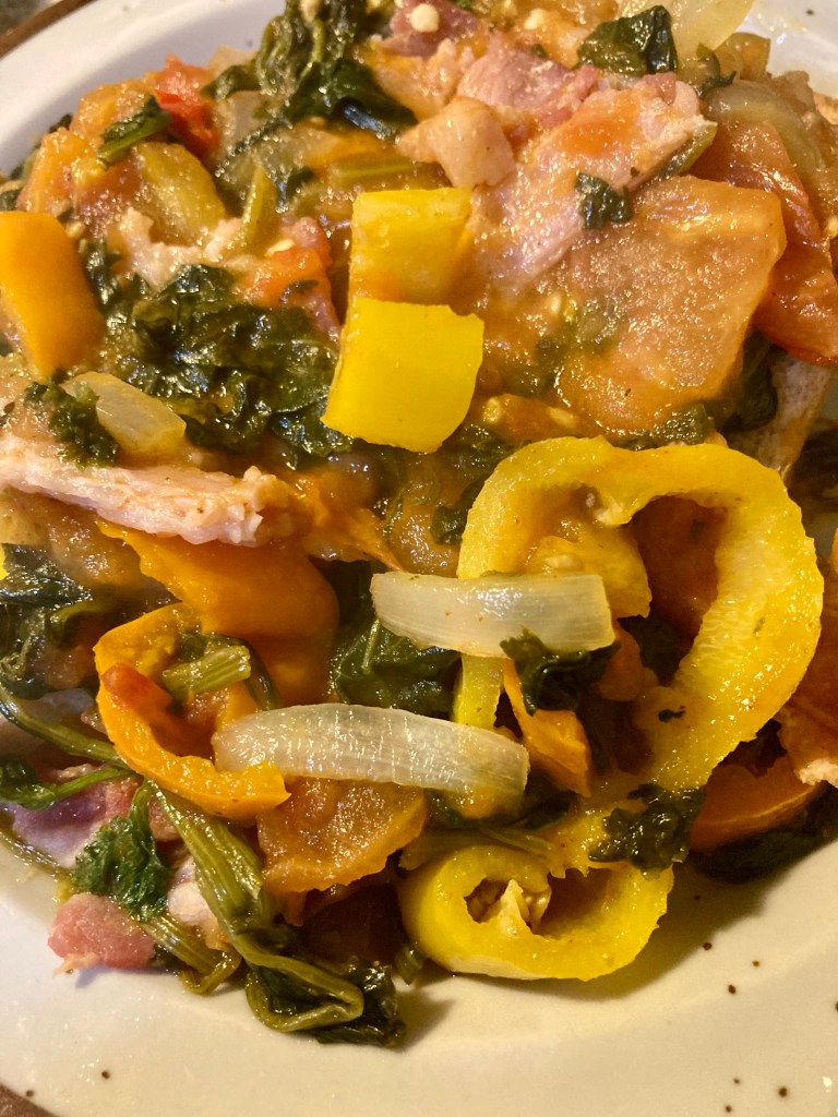 Sweet onion, yellow, red, and orange sweet peppers, parsley, spinach, tomatoes, bacon pieces, Diablo and Fire sauce (from the bottles this time, not the cursed “sauce drawer”), pink Himalayan salt and black pepper, all cooked up in butter. Will definitely have to remember this, the next time I have any extras from making loaded street tacos.