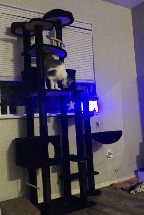 Bubbling water fountain with a blue light so he can find it in the dark (which was new, but will encourage him to hydrate and stay healthy), cat tree from kiddo’s bf’s mom (and it is a VERY big and awesome cat tree, as you can see), lights they had hangin’ out already, added for ambiance to his cat tower experience.