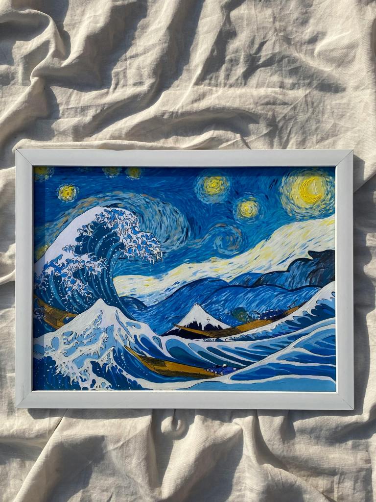 I’m not sure if I was specifically looking for art of The Great Wave, or how I came across it, but I think on eBay, a LONG time ago, someone was selling a t-shirt covered in The Great Wave. I ordered it, cut out part of the design, stitched it onto my jacket, and decorated it with fabric paint.