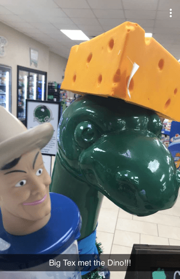 BAH I didn’t crop them all evenly. They came from her Snapchat. Hence the style of the captions. But, here we have Big Tex meeting the infamous dino at the Dino Stop gas station, where we also took kiddo’s boyfriend when he visited. It’s loaded with Packers and cheesehead paraphernalia, which checks out– close to the stadium. And a trip to the grocery store, where kiddo thought Big Tex would be amused by the sign that read, “It just wouldn’t be Wisconsin without lots of ice.” But couldn’t it be?! Pretty please?