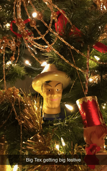 Holidays and birthdays without her are still hard, so this one was very, very precious, for everyone involved. Even Big Tex. Here he is, nestled in the family Christmas tree. Getting “big festive.”