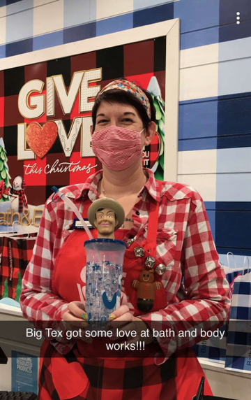 Big Tex came with to check out the fragrances, and one of the employees was kind enough to pose with him, and even gave us permission to use the pic on social media. You can see how tickled she was by the request. I don’t imagine it’s every day that they’re asked to pose with a cowboy water bottle LOL.
