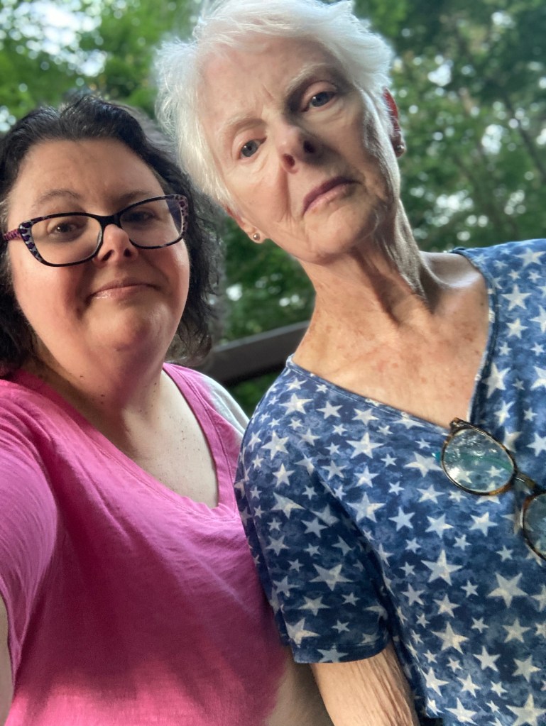 BUT, I relented, and had a lovely meal. Salad, even. And cooked veggies. And my mom and I went for a walk. I got a selfie of us on a walking bridge over a wooded ravine in their neighborhood.