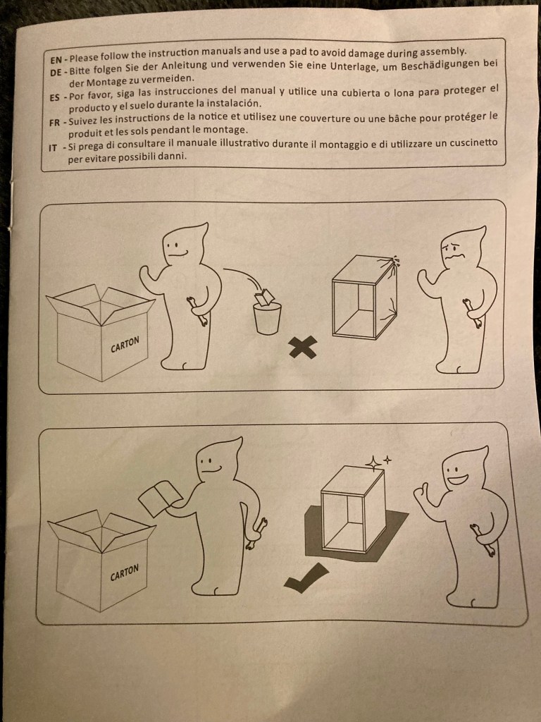 I love the “devil may care” expression on the first person’s face as they chuck the directions in the garbage. It made me recall the many, many times my dad insisted he didn’t need them. Inevitably, we’d have to backtrack and take pieces apart again, and start over, with the directions. But retrospect has made the memories fond, rather than stressful. We can all laugh about it now.