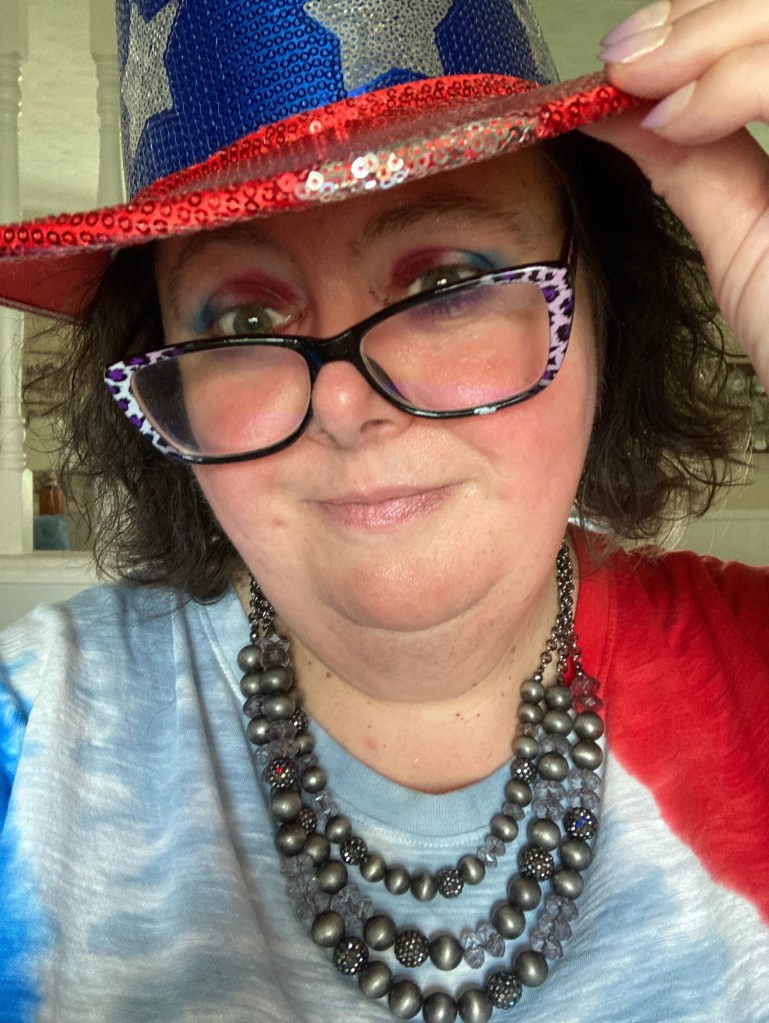 Since she was that enthusiastic about my look (the only customer to react that way, though both my coworkers complimented me), I also pointed out my red, white, and blue eyeshadow, somewhat masked by both the brim of my cowboy hat, and my glasses.