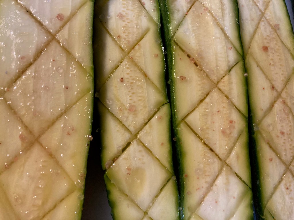 A blog I found with a similar recipe to the one shared on Facebook that I discovered, states that the deeper you can make the scoring cuts, the better; that you should use a VERY sharp chef’s knife. Mine’s a little dull, and rather unwieldy for zukes as small as what I picked up. The set came with a sharpener. I just have to take the time to sharpen the blade. Anyway, I used a stainless steel serrated steak knife. Maybe not ideal, but it worked okay.
