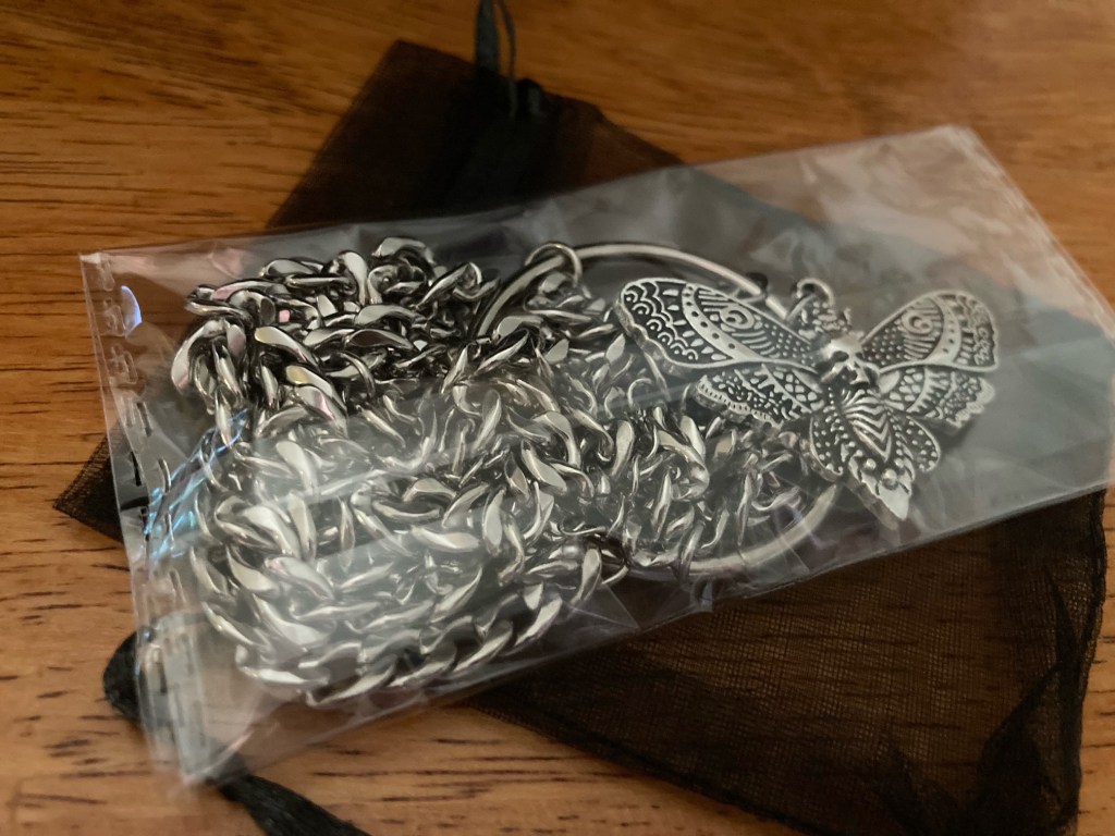 Her necklace! I hope all the jewelry fits her. I know I’ve lost some weight even in my arms, and the bracelets didn’t have a WHOLE lot of extra room in them. I still had to snap them on the loosest setting. But we’ll see. Here’s hoping.
