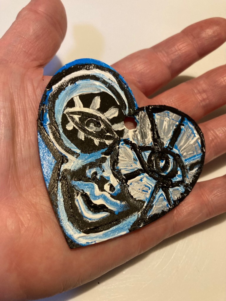 Lastly, I think I also mentioned that I had a Valentine’s Day heart I hadn’t yet decorated? It also occurred to me this morning that at least with the wooden ones, I could paint the back sides, too. Dunno if I will be industrious enough to try any of that tonight, but here’s an earlier look at the last remaining one. Since this pic, I added more white in a couple spots, and crisped up the black. I may post an updated pic once I’ve taken one. That just sounds like mega-effort right now… not that this post WASN’T… but hey. I also may clean it up a little more than I have already. We’ll see.