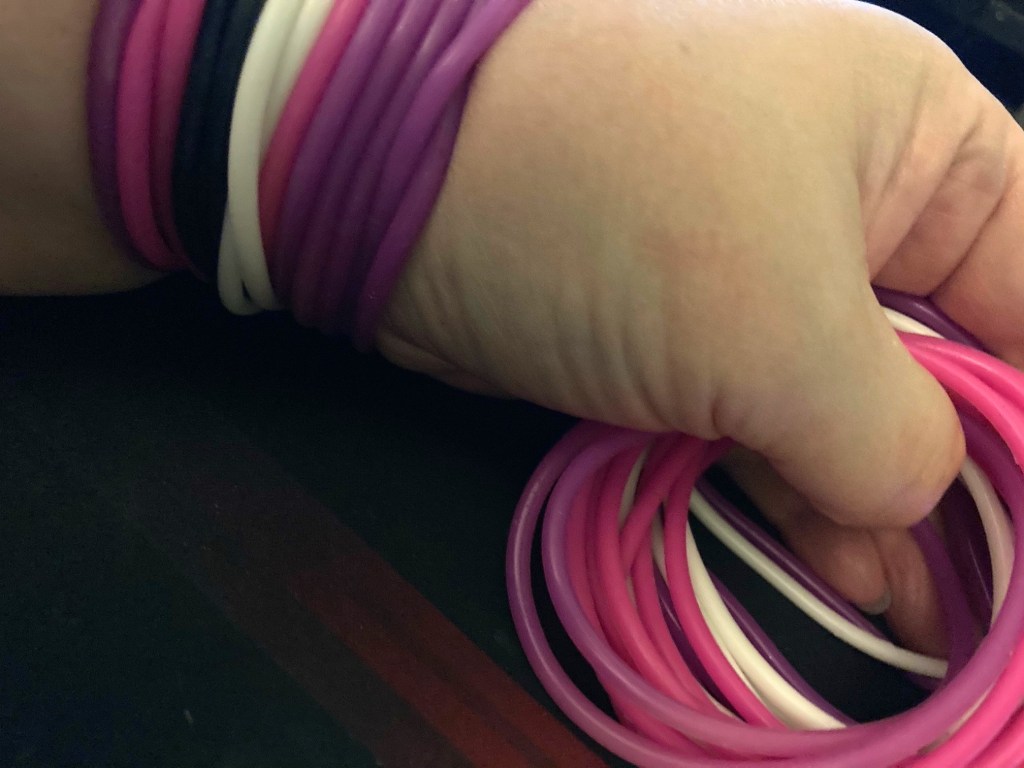 As I was putting them in my locker, I noticed something on the bottom of one bag, which I thought was a bunch of hair ties. Didn’t even occur to me until now that my hair is probably too short for hair ties, but in the moment, I had thought, huh, cool! New hair ties. Never been used!