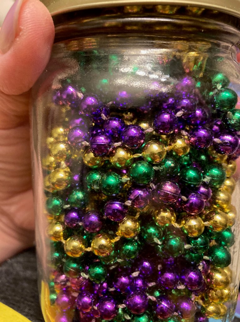 Once I got home, I had the notion to display some of the beads in jars. I have two already set up, one in the bathroom, and one in the living room, now that the French Quarter look has spilled out into the rest of the apartment, some, with my framed art prints of Creole food, and so on.