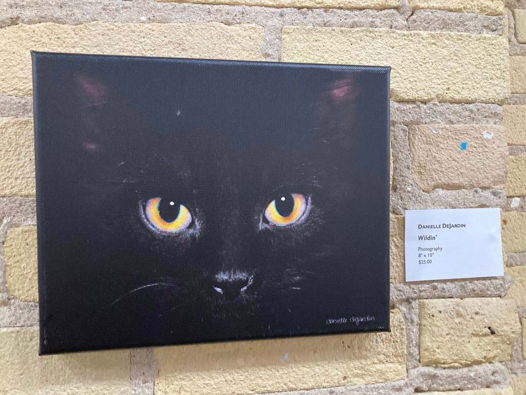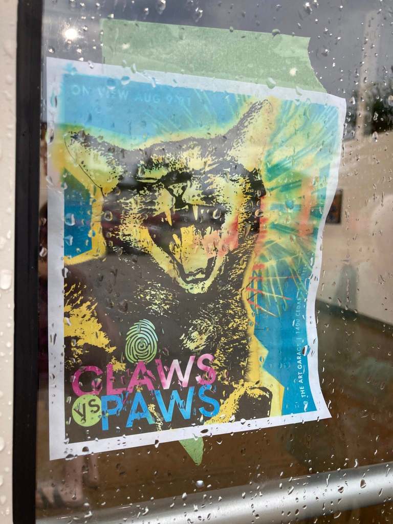 Our last stop together was an art gallery that has also shown my work in the past. Tonight was the opening of Claws vs Paws, a show with portraits of cats and dogs. Just before we headed in, I had said I hoped they had snackies, because I could go for some cheese (they did, indeed, have snackies, and I had just a nibble of cheese, a cracker, and two or three baby carrots with dip).