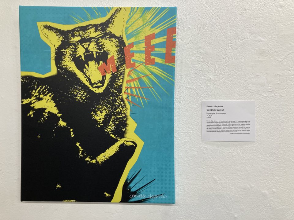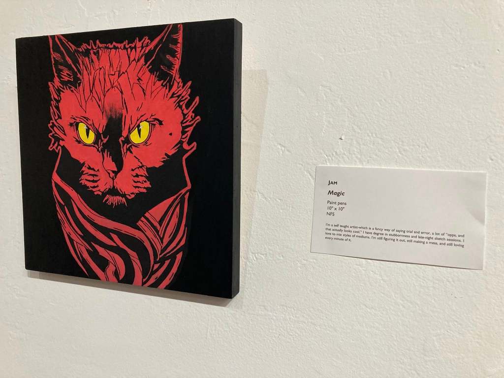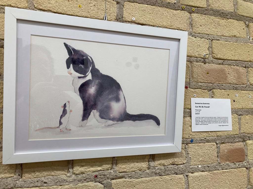 Samantha Surowiec’s Can We Be Friends? watercolor, which she said was made with only 3 colors, I believe. She was standing in front of her piece, so we got the scoop on its inspiration. Her kitty apparently really just wanted to play with a mousey, but the mousey eventually ran away.