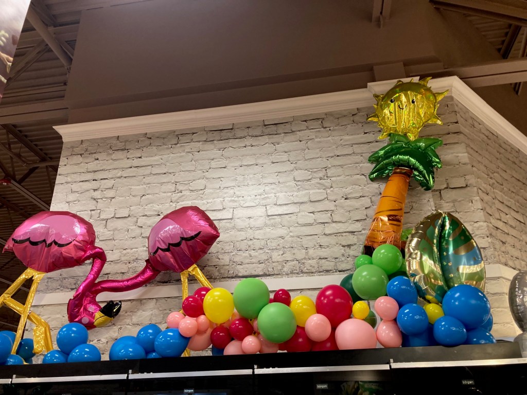 What was REALLY cool at the store, though, was this display of balloons over the refrigerated case in the floral department, which reminded me of a coworker and her love of flamingos.