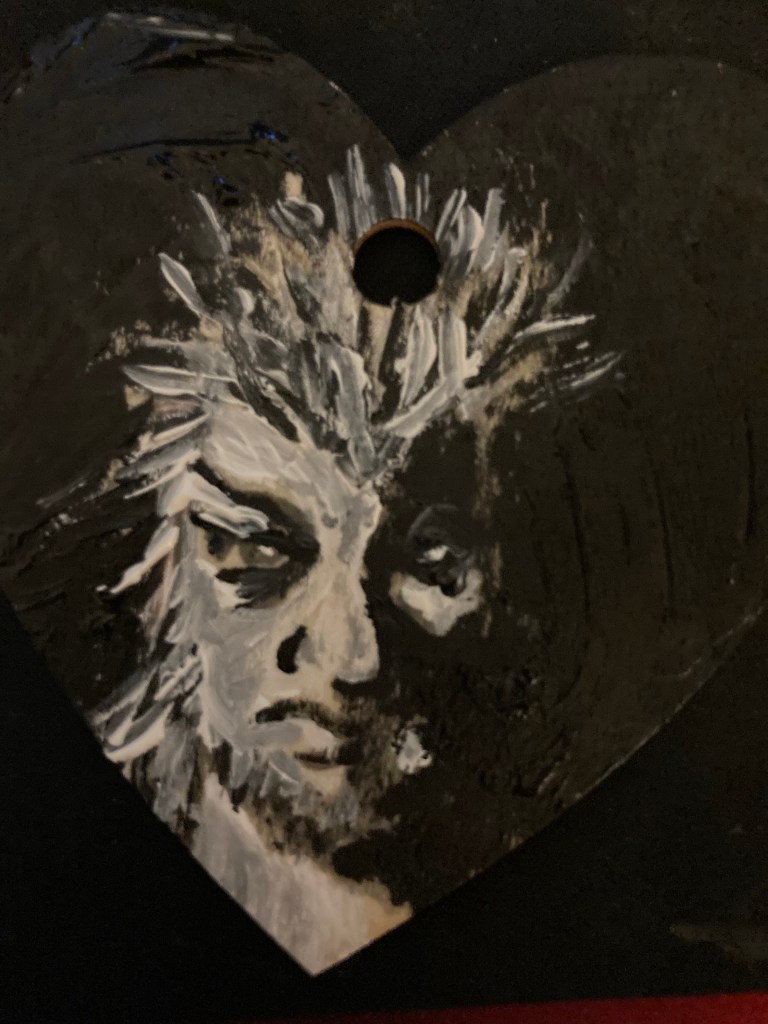 Especially considering I did it in very little time, and that I was reproducing a much larger piece onto the back of one of the wooden Valentine’s Day hearts, which fit in the palm of my hand. Been working on smaller detail work.
